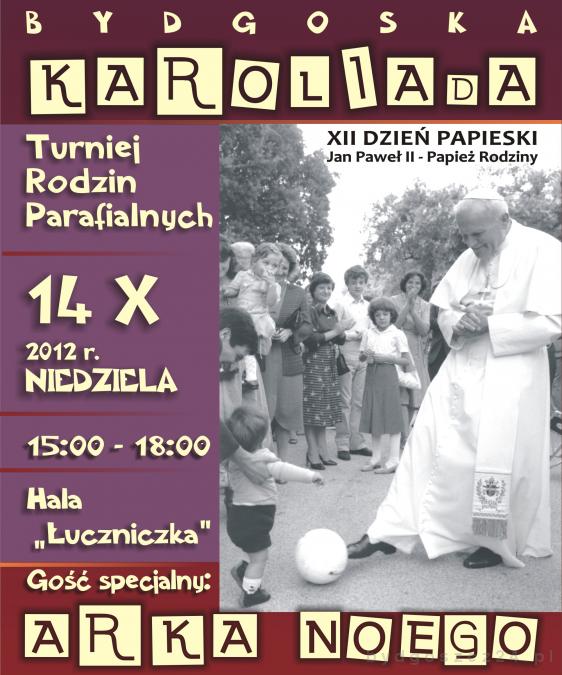 Tegorocznemu Dniu Papieskiemu przyświecać będzie hasło “Jan Paweł II – Papież rodziny”. – Chcemy pokazać postać Ojca św. od okresu jak był dzieckiem, jak wzrastał w rodzinie, aż został papieżem. To dar Pana Boga i wspaniały przykład do naśladowania – mówi ks. Krzysztof Buchholz, prezes Fundacji “Wiatrak”. – Zapraszamy w tym roku wszystkich bydgoszczan do wzięcia udziału w szczególnym wydarzeniu jakim jest “Bydgoska Karoliada”. Jest to turniej rozgrywany pomiędzy parafiami, obejmujący konkurencje sportowe, artystyczne i intelektualne. Nagrodą dla zwycięzców turnieju będzie wyjazd na pielgrzymkę na Jasną Górę – dodał.