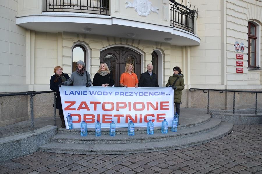 ?Lanie wody prezydencie? Zatopione obietnice? – głosił napis na banerze, który przenieśli mieszkańcy Miedzynia pod bydgoski ratusz. Niedawno rozmawiali ze skarbnikiem miasta, który ich przekonywał, że nie ma w kasie miejskiej pieniędzy na budowę basenów osiedlowych. Kilka dni później prezydenta Rafał Bruski oświadczył, że ma 30 mln zł na budowę basenu? na Kapuściskach.