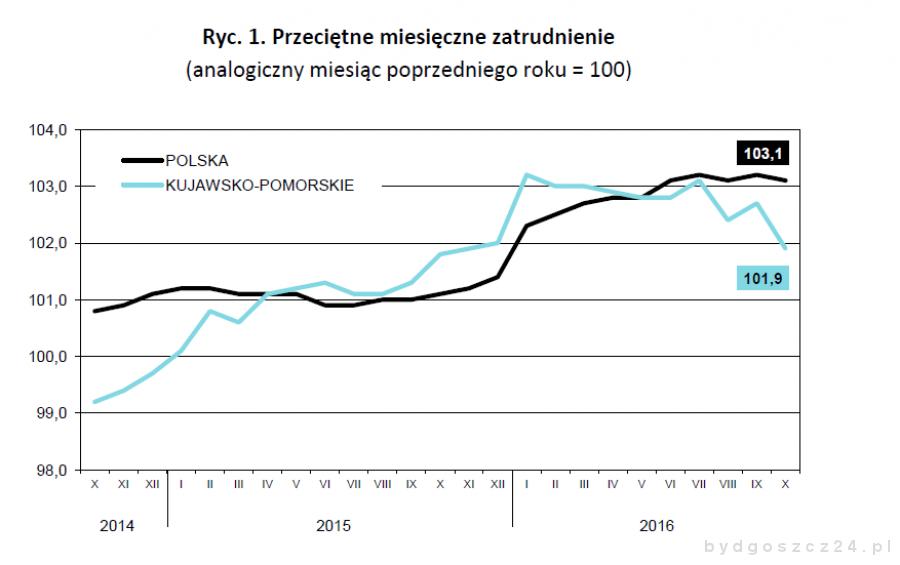 * * *W województwie kujawsko-pomorskim w październiku 2016 r. przeciętne zatrudnienie w sektorze przedsiębiorstw ukształtowało się na poziomie 248,6 tys. osób, co oznacza że było wyższe o 1,9% rok do roku, ale o 0,1% niższe w stosunku do poprzedniego miesiąca.