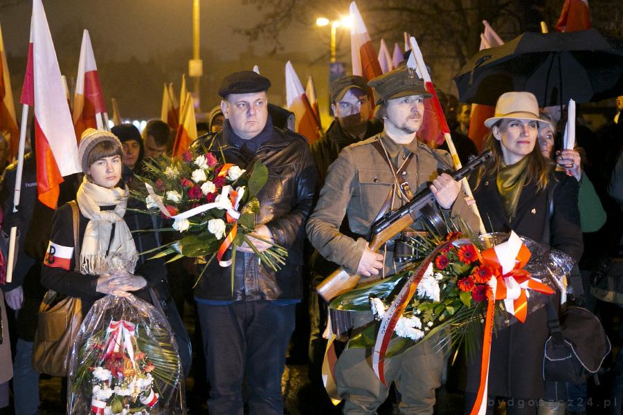 Później prowadzący zgromadzenie Jerzy Mickuś z Stowarzyszenia Piłkarskiego Zawisza zaprosił do zabrania głosu młodych liderów organizacji narodowych. Przedstawiciel Narodowej Bydgoszczy mówił o trudnych czasach prześladowań chrześcijan na świecie i niełatwych ciągle w Polsce. – Nie chcemy wyjeżdżać, a jednak coś jest nie tak. Dlatego proszę was, a zarazem apeluję: wracając do domu niech każdy z was, każdy z osobna wspomni o “Ince”, Pileckim, czy “Łupaszce”, o panu Alojzym. Niech ta legenda żyje w nas, historia, która brzmi jak bajka o bohaterach. A jednak wydarzyła się naprawdę. Odwagi ludzie, a wszystko będzie dobrze. Cześć i chwała Bohaterom! Niech mury, gdzie cierpieli polscy bohaterowi usłyszą wołanie: Cześć i chwała Bohaterom! – zaintonował.