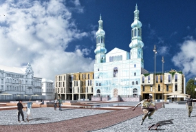 Zachodnia pierzeja Starego Rynku z fasadą kościoła z półprzezroczystego szkła