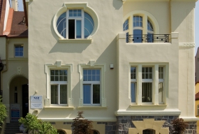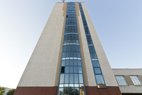 Bank Pocztowy przy rondzie z zewnętrznymi windami panoramicznymi