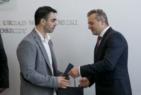 Wojewoda Mikołaj Bogdanowicz uhonorował i podziękował Wojciechowi Skrzyńskiemu, ratownikowi medycznemu bydgoskiego pogotowia za wzorowo przeprowadzoną akcję ratowania życia bydgoskiej policjantce.